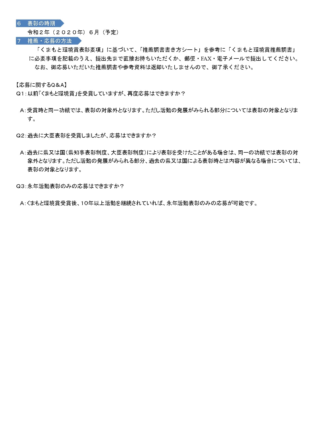 ※過去に県又は国により表彰(「くまもと環境賞」含む知事表彰制度、大臣表彰制度等)を受けた方についても、活動の発展がみられる部分については表彰の対象となります。