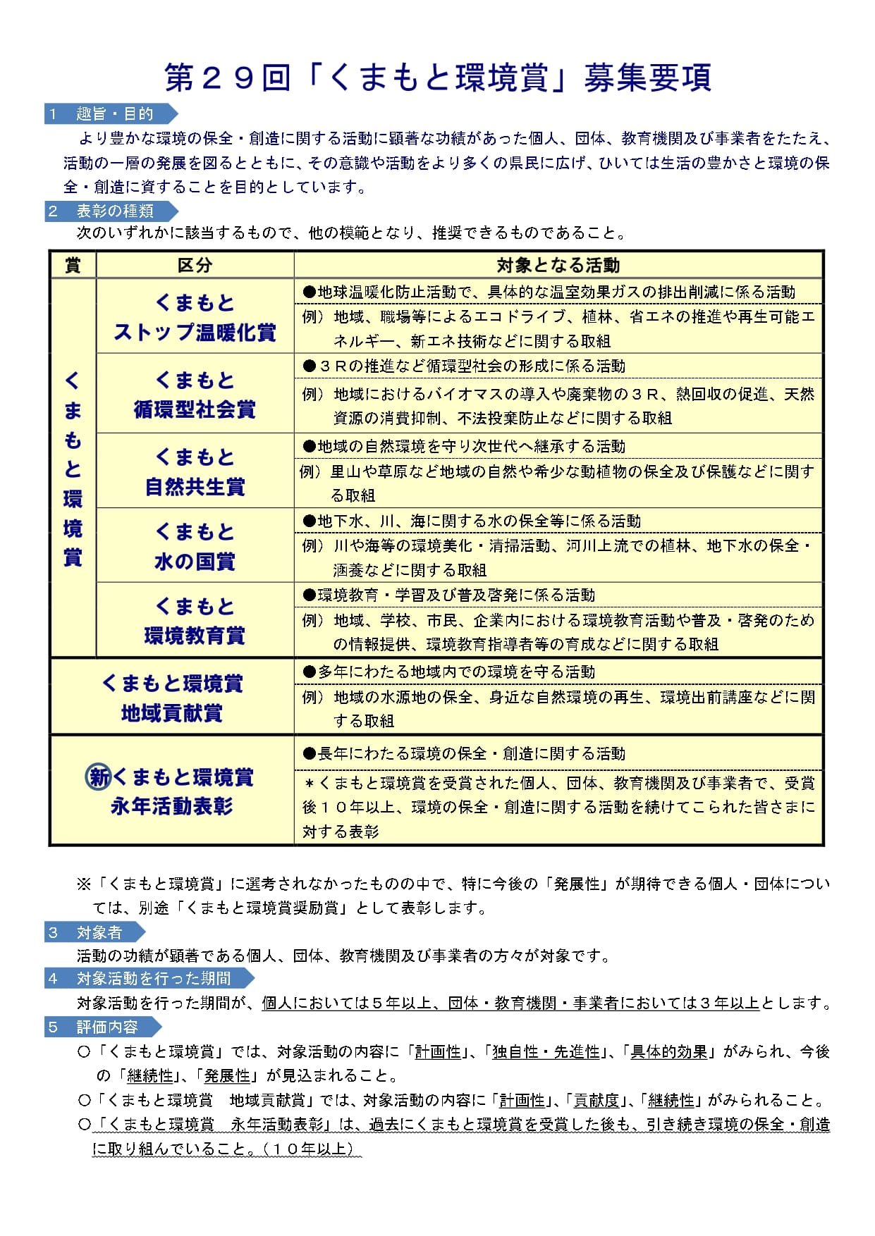 ※過去に県又は国により表彰(「くまもと環境賞」含む知事表彰制度、大臣表彰制度等)を受けた方についても、活動の発展がみられる部分については表彰の対象となります。